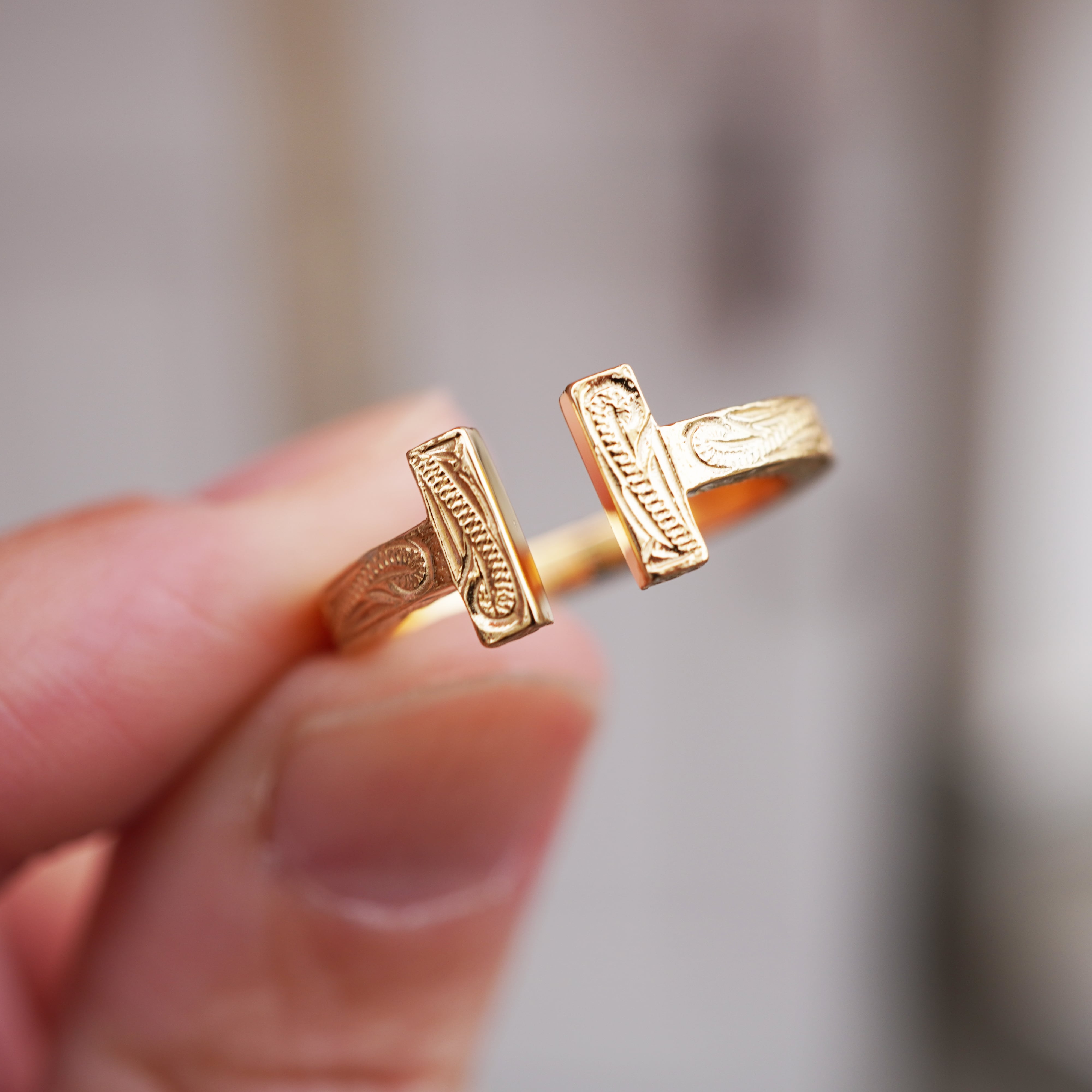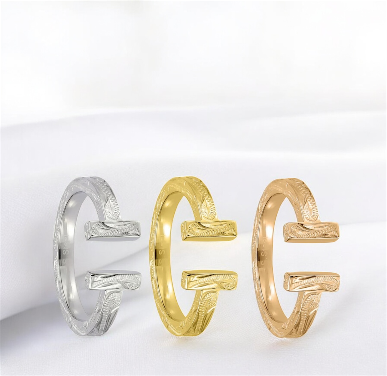 金属アレルギーに強いステンレスで出来た全体に彫りが入っているTリング。