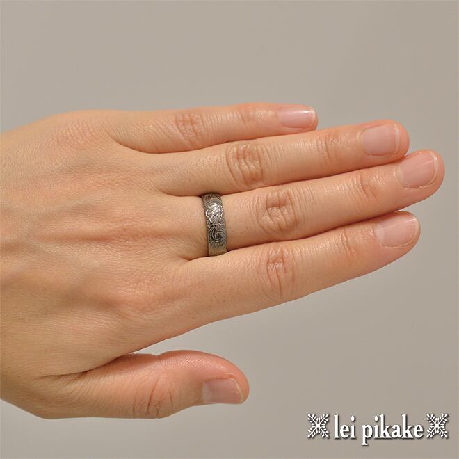 金属アレルギーに強いステンレスで出来た全体に彫りが入っているリング。