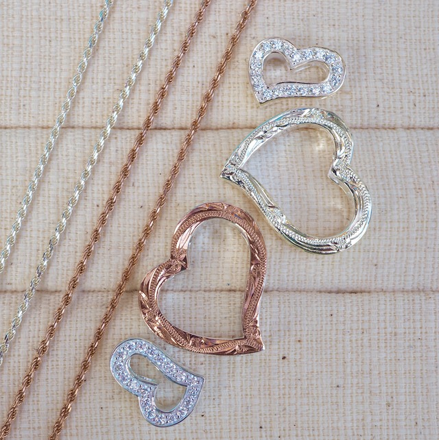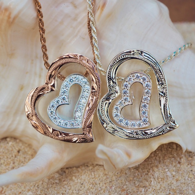 ハートの中に綺麗な人工ダイヤモンドのジルコニアで出来たもう1つのハートが入っているダブルハートの大人気のペンダントヘッドです。